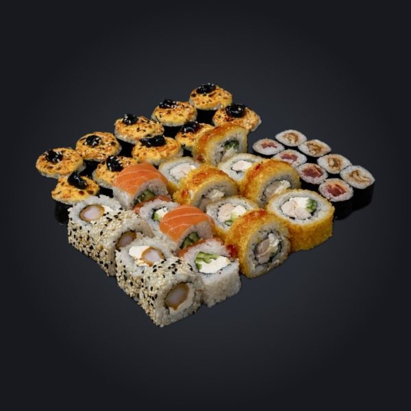Состав: Филадельфия классик 1/2, Филадельфия с тунцом 1/2, Сушинка 1/2, Запеченный с копченой курицей, Жареный ролл с копченым лососем, Жареный ролл с мидиями, Ролл с огурцом и мидиями.