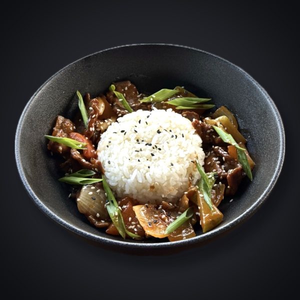 Состав: говядина, болгарский перец, кабачок, репчатый лук, зеленый лук, чеснок, кунжут, устричный соус, паста «Кочудян».