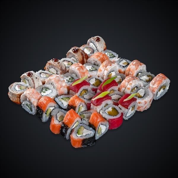 Состав: Филадельфия классик — 1/2, Калифорния с креветкой — 1/2 , Дракон — 1/2 , Мидии и снежный краб — 1, Фудзияма — 1.