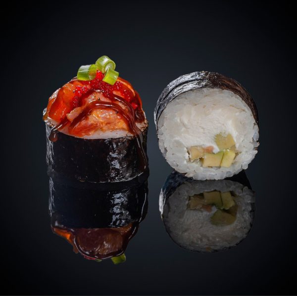 Состав: Лосось, креветка, тунец, сыр «Cremette», огурец, авокадо, икра масаго, зеленый лук, соус «Унаги», соус «Спайс», нори, рис