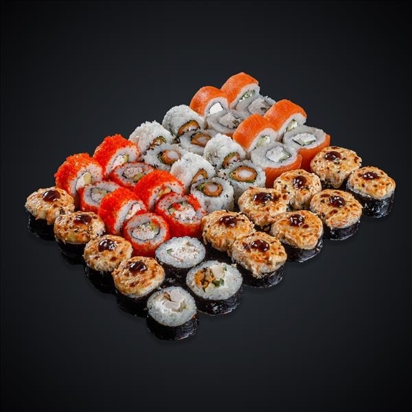 Состав: лосось, угорь, креветка, тунец, сыр «Cremette», манго, огурец, авокадо, икра масаго, соус «Унаги», соус «Спайси», нори, рис.