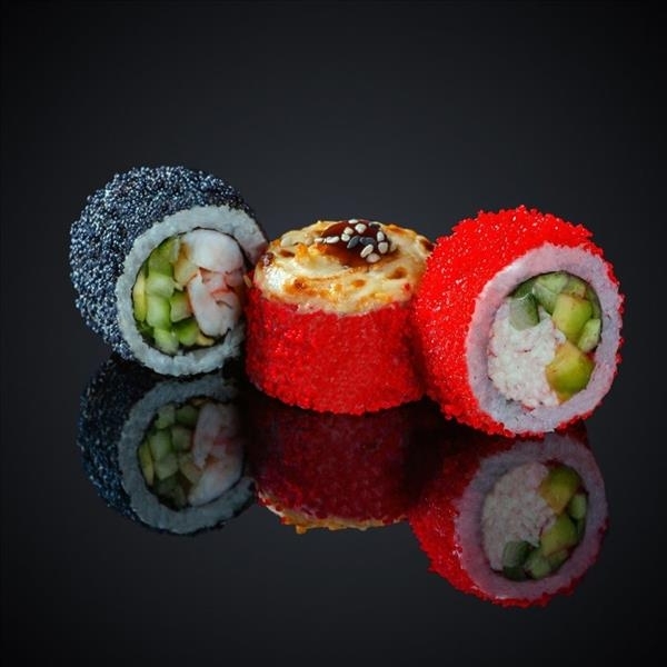 Лосось, тунец, огурец,сыр “Cremette”, соус Гавайский, соус Унаги, панировочные сухари, кляр, кунжут, нори, рис.