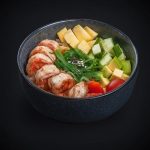 Состав: соус том-ям, моцарелла, креветки, кальмары, томаты черри, шампиньоны, лук красный, лук зеленый, кинза, кунжут.