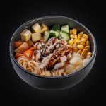 Состав: соус том-ям, моцарелла, креветки, кальмары, томаты черри, шампиньоны, лук красный, лук зеленый, кинза, кунжут.