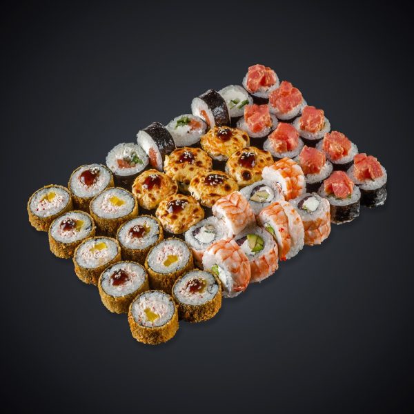 Состав: лосось, угорь, тунец, лосось копченый, креветка, креветка в темпуре, снежный краб, мидии, авокадо, сыр “Cremette”, нори, рис.