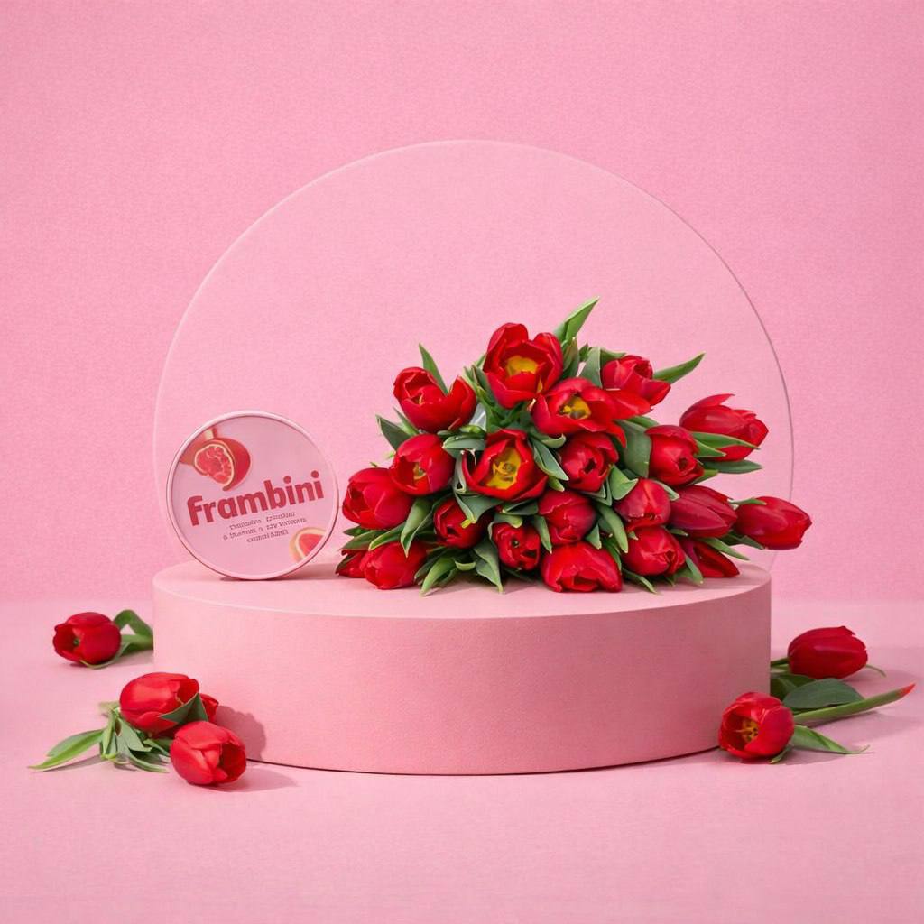 Букет из 21 тюльпана, сет роллов (Филадельфия классик, Сердцеед, Филадельфия с угрём и авокадо), малина Frambini в белом молочном шоколаде