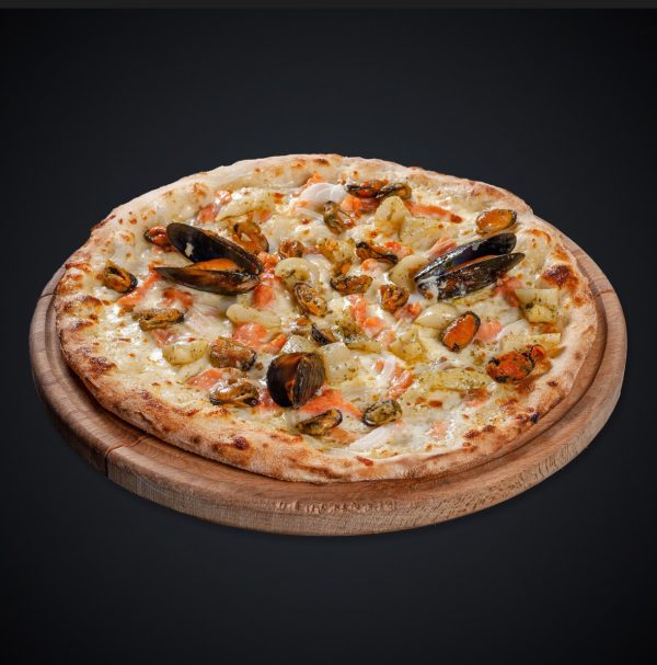 Состав: мидии, лосось, кальмар, чеснок, каперсы, лук репчатый, сыр моцарелла, сливочный соус.