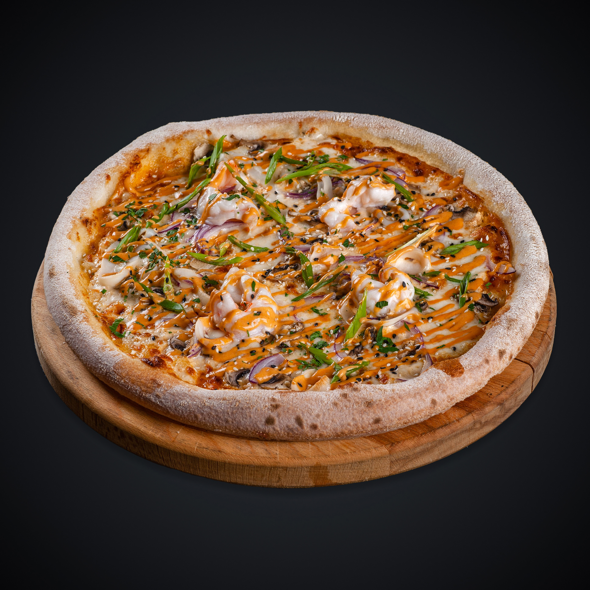 Состав: соус том-ям, моцарелла, креветки, кальмары, томаты черри, шампиньоны, лук красный, лук зеленый, кинза, кунжут.