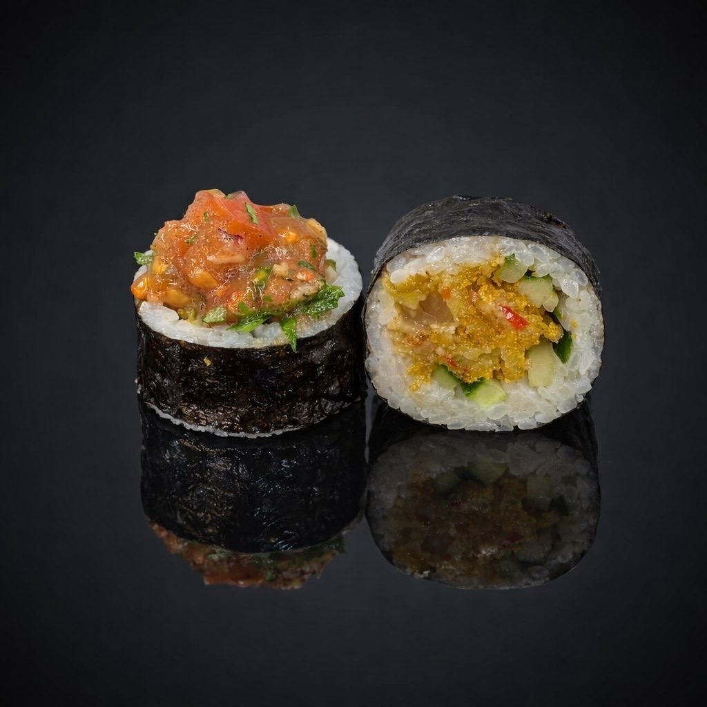 Состав: креветка, лосось, авокадо, огурец, сыр “Cremette”, соус “Спайси”, икра “Масаго”. нори, рис.