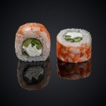 Состав: креветка в темпуре, салат “Айсберг”, сыр “Пармезан”, соус “Гавайский”, кунжут, нори, рис.
