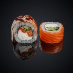 Состав: Лосось, креветка, тунец, сыр «Cremette», огурец, авокадо, икра масаго, зеленый лук, соус «Унаги», соус «Спайс», нори, рис