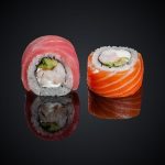 Состав: лосось, авокадо, огурец, майонез, икра “Масаго”, нори, рис.