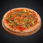 Состав: соус томатный, сыр моцарелла, куриное филе, ветчина индейки, помидоры, лук красный, маслины, перец болгарский, перец халапеньо.