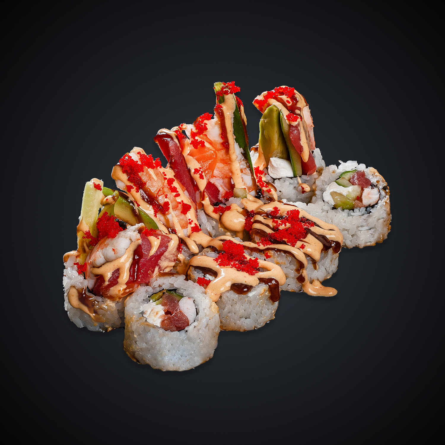 Состав: лосось, тунец, креветка, сыр «Cremette», огурец, авокадо, икра масаго, зеленый лук, соус «Унаги», соус «Спайси», нори, рис.