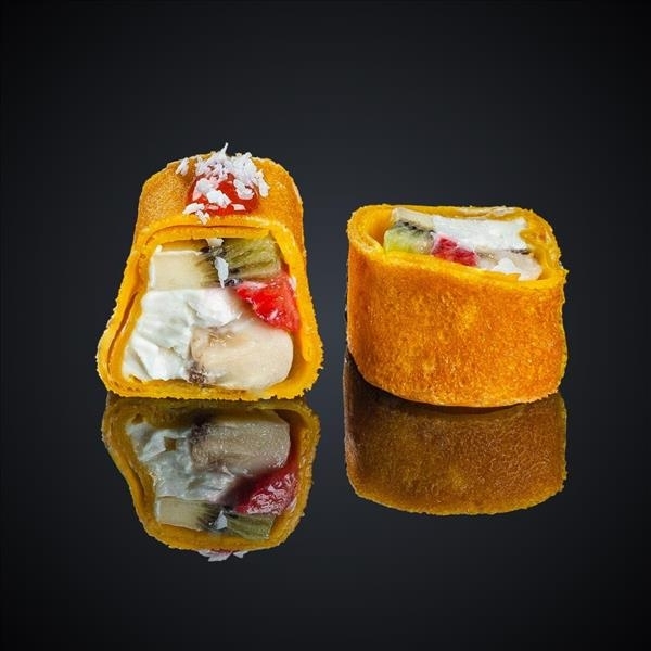 Блинчик, сырный крем, апельсин, киви, банан, кокосовая стружка, топпинг.