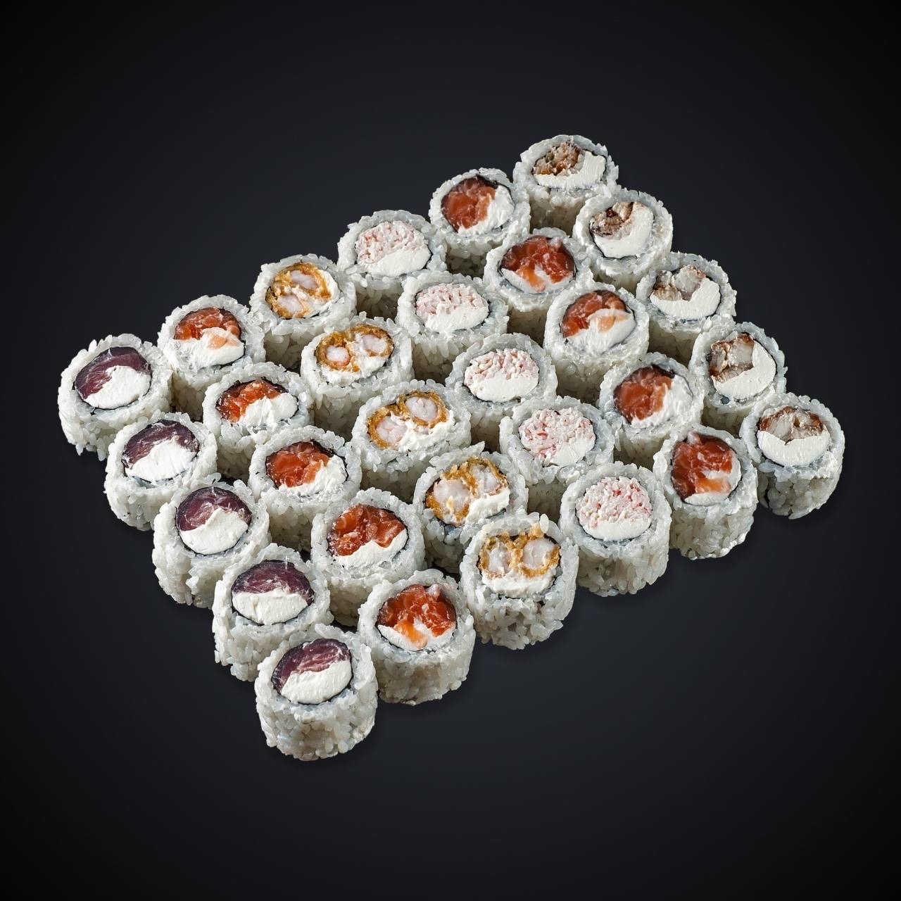 Состав: лосось, угорь, тунец, креветка темпура, копченый лосось краб снежный, сыр, соус «Гавайский», нори, рис