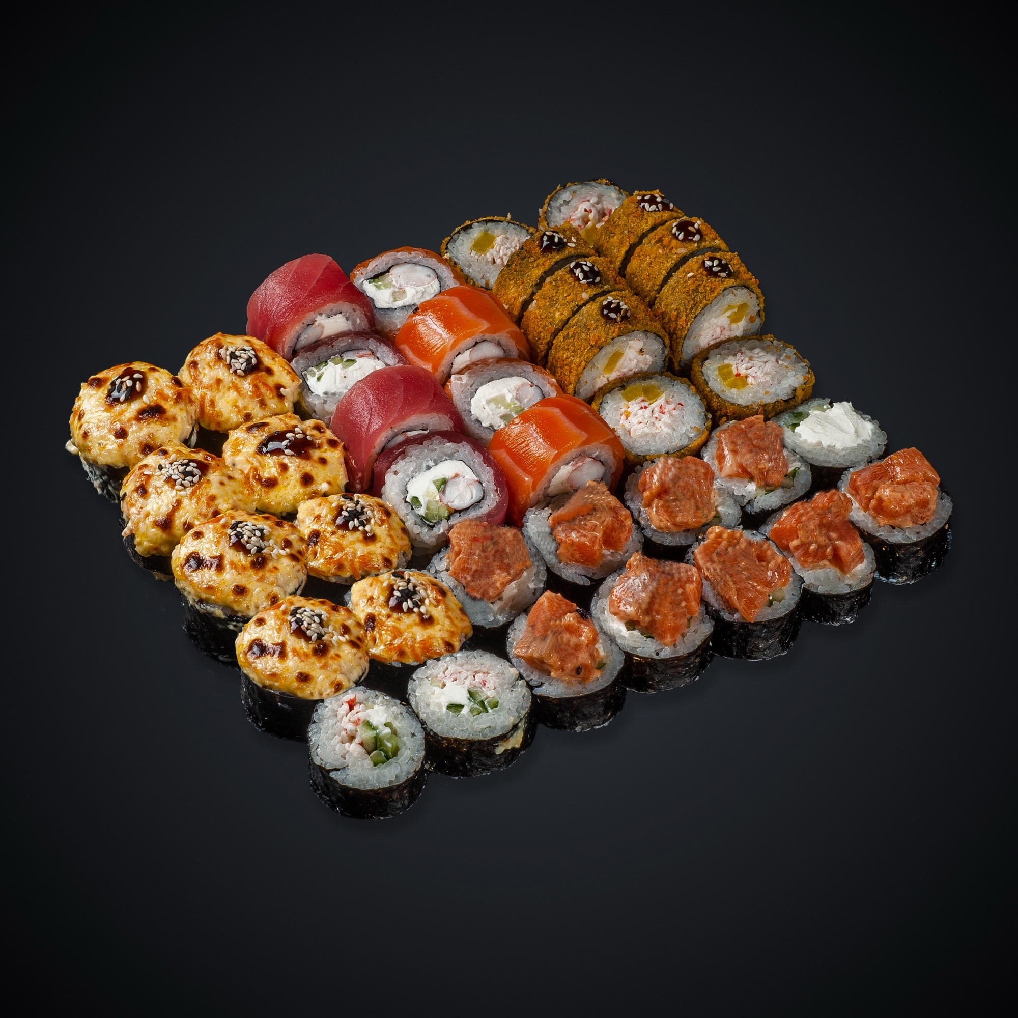 Запеченный от Катаны — 1/2, Запеченный с лососем — 1/2, Запеченный с мидиями и снежным крабом — 1шт, Запеченный с копченой курицей