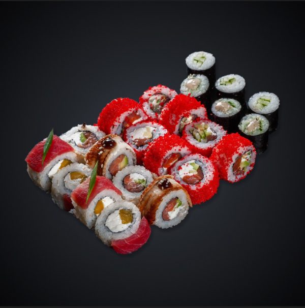 Состав: Калифорния с лососем — 1/2, Праздничный 1/2, Филадельфия де Люкс — 1/2, Сливочный тунец с манго — 1/2, Ролл с чукой — 1/2, Ролл с огурцом — 1/2.