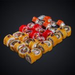 Состав: Филадельфия классик — 1/2, Калифорния с креветкой — 1/2 , Дракон — 1/2 , Мидии и снежный краб — 1, Фудзияма — 1.