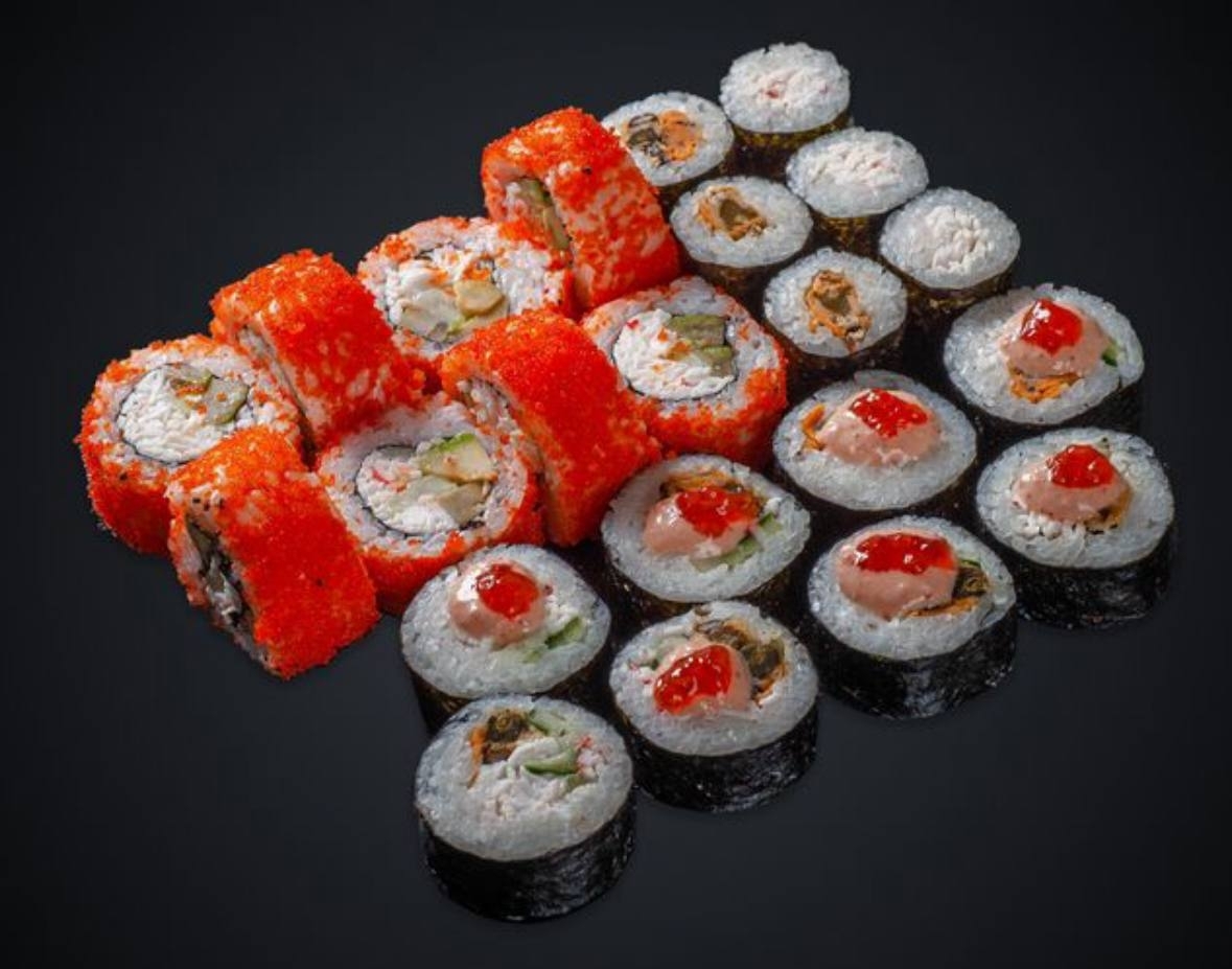 Состав: Филадельфия классик — 1/2, Филадельфия с креветкой — 1/2, Ролл с авокадо — 1/2, Ролл с огурцом — 1/2 .